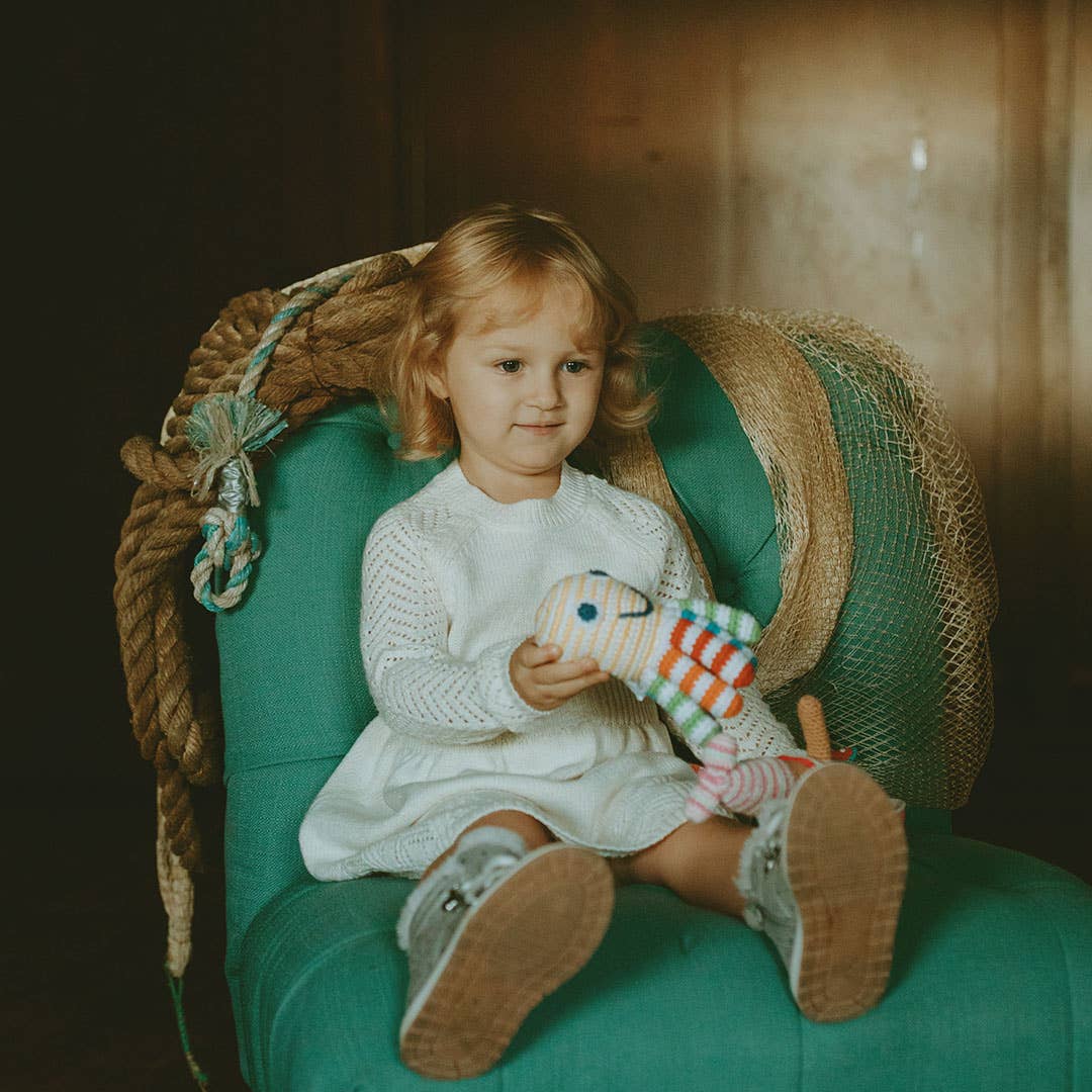 This happy little plush octopus rattle is an eye catcher! Full of color and personality, this stuffed animal is the perfect stroller companion and loves summer trips to the beach. Handmade with lightweight cotton yarn, its soft rattle when shaken is sure to bring endless laughter and joy to babies everywhere. The tentacles are perfect for tiny hands to grab a hold of.