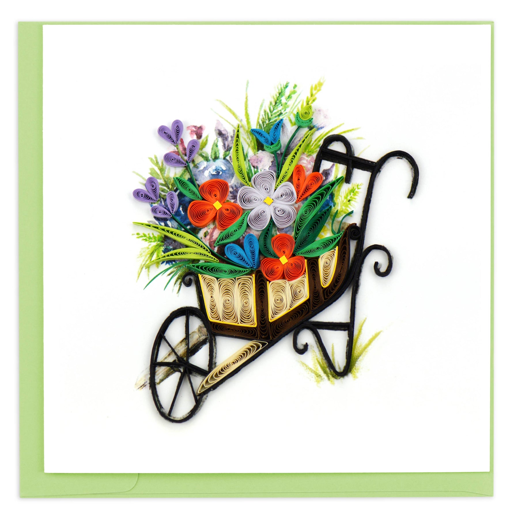The perfect card for you to send to a friend with a green thumb! Our Quilled Wheelbarrow Garden Greeting Card depicts a brown wheelbarrow with flowers inside of it. The flowers are in vibrant hues of purple, red, blue, yellow and green.