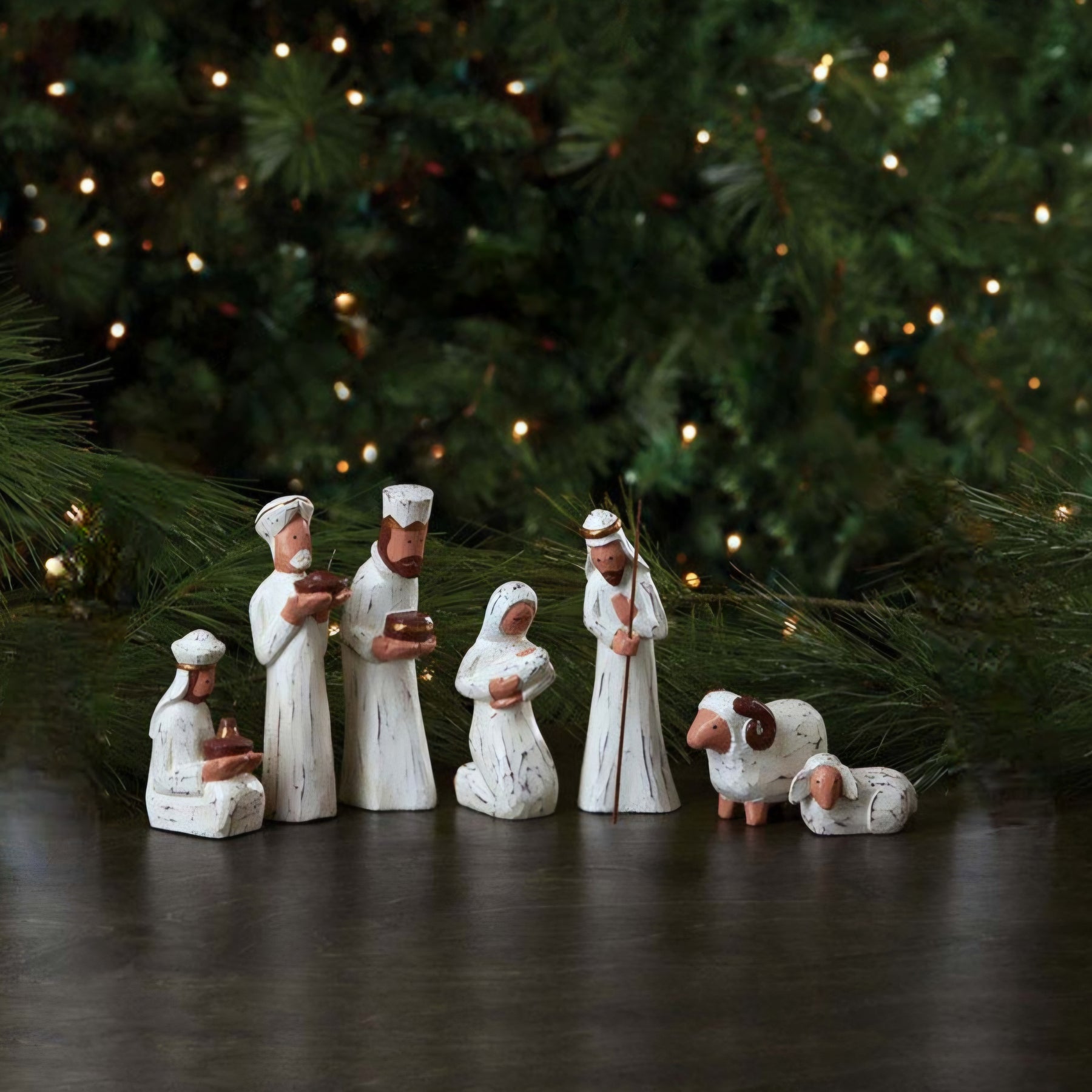 Peaceful and joyous, this wooden nativity set displays the timeless Christmas story. Natural albizia wood is carved, whitewashed, and painted by hand to create this modern nativity scene.