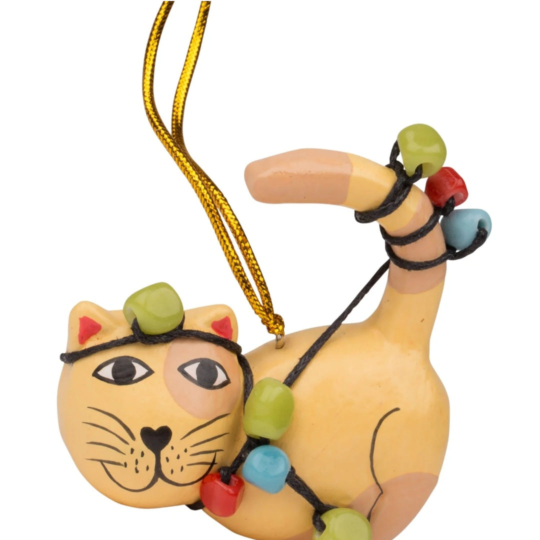 Indonesian artisans hand-carve and hand-paint this delightful albesia wood ornaments of a design of an adorable kitty that was tangled up in holiday lights. Albesia wood is sustainably harvested for craft use by our artisan partner Mitra Bali, committed to protecting the natural beauty and resources of Indonesia.